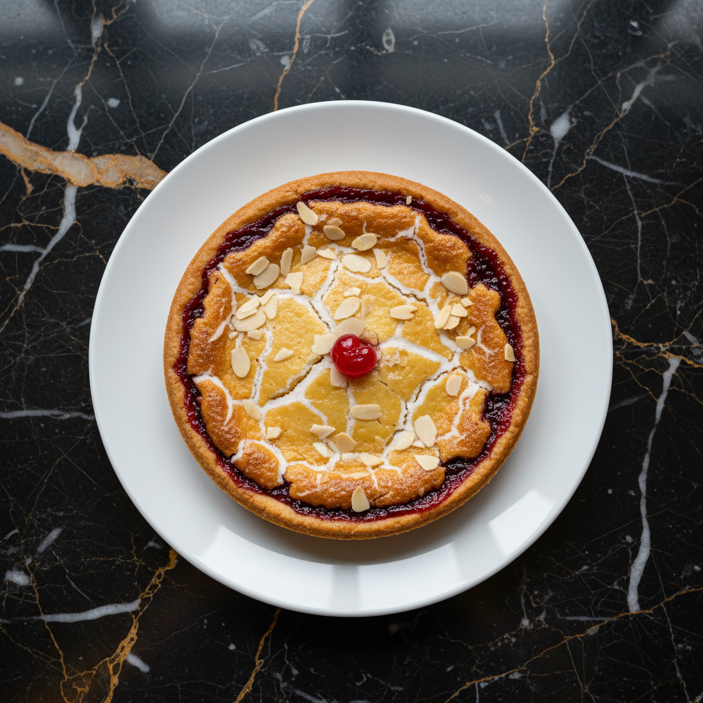 A quintessential British almond tart featuring a crisp shortcrust pastry base, a layer of sweet raspberry jam, and a rich, nutty frangipane filling, traditionally from Bakewell, Derbyshire.