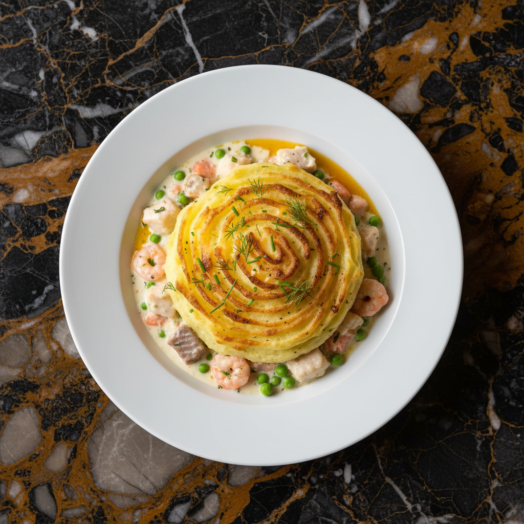 A comforting and classic British fish pie, featuring a medley of flaky fish in a creamy sauce, topped with a generous layer of fluffy mashed potatoes and baked until golden.