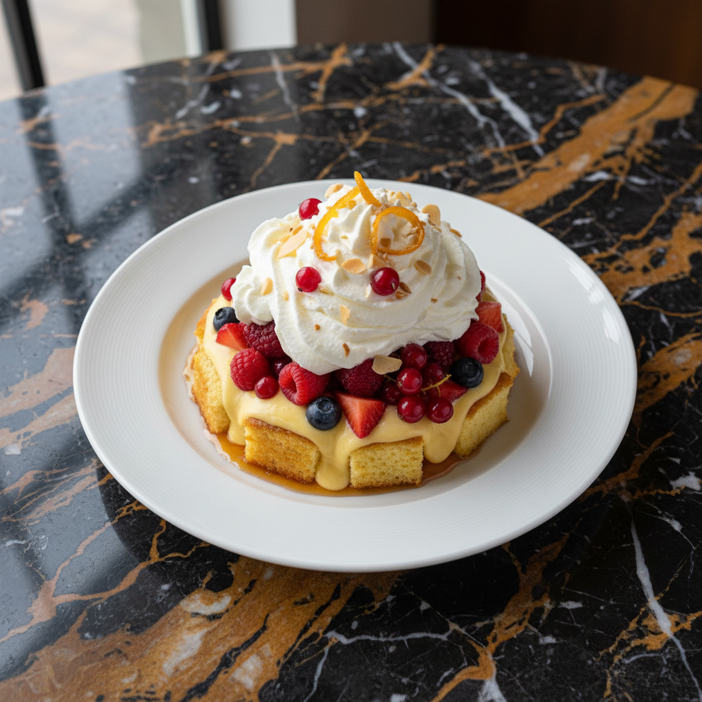 A quintessential British layered dessert, featuring cubes of sponge cake soaked in sherry, topped with fruit, rich custard, and whipped cream. A beloved centerpiece for celebrations, especially Christmas.