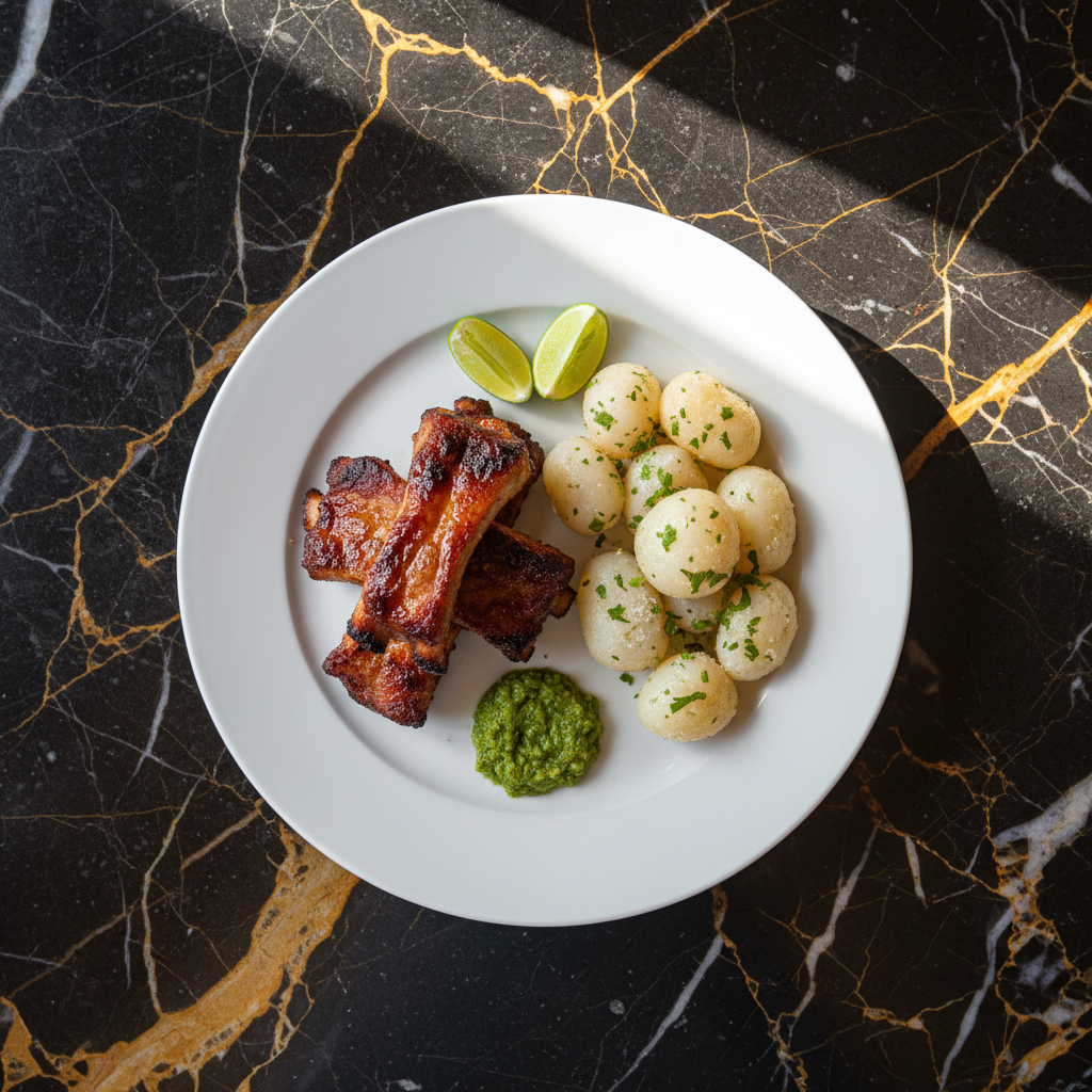 Tender, flavorful pork ribs marinated and slow-grilled to perfection, a staple of Colombian fritanga. Served with simple boiled potatoes.