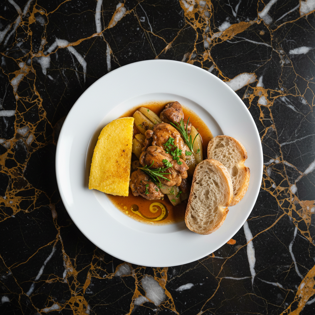 A traditional San Marinese dish featuring rabbit braised with aromatic fennel, creating a tender and flavorful meal often served with a side of polenta or crusty bread.