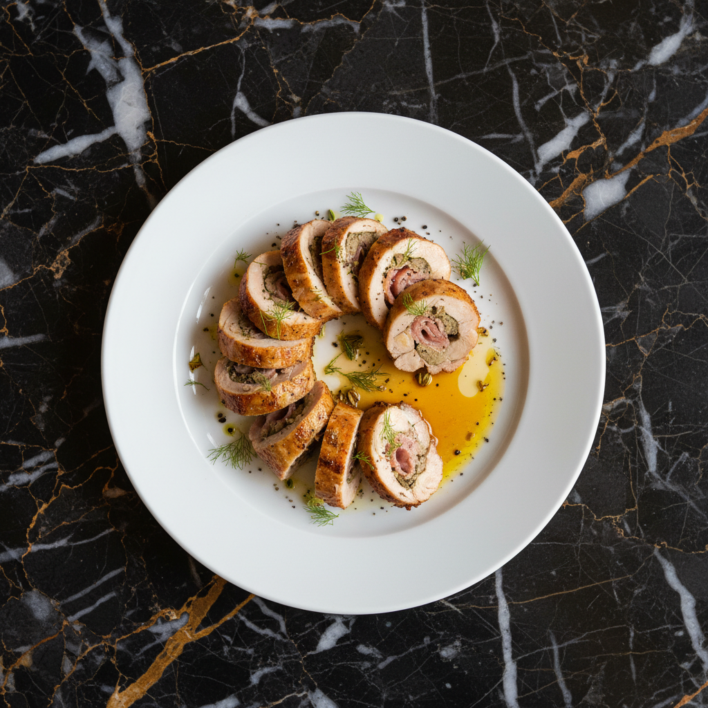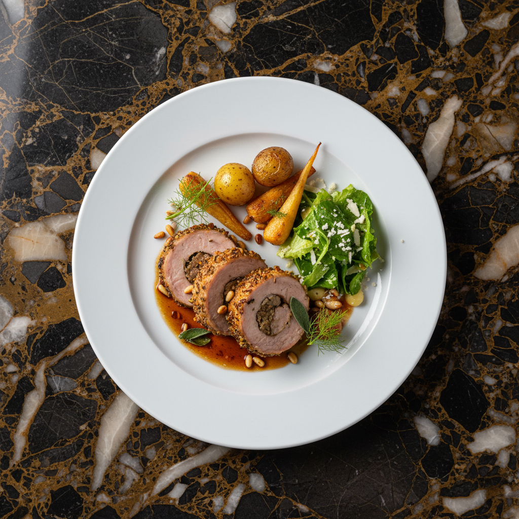 Coniglio in Porchetta is a traditional rabbit dish prepared in the style of 'porchetta,' which traditionally involves stuffing and roasting pork with wild fennel. In this variation, rabbit is seasoned, often stuffed with prosciutto, pancetta, and wild fennel, then roasted until tender and flavorful.