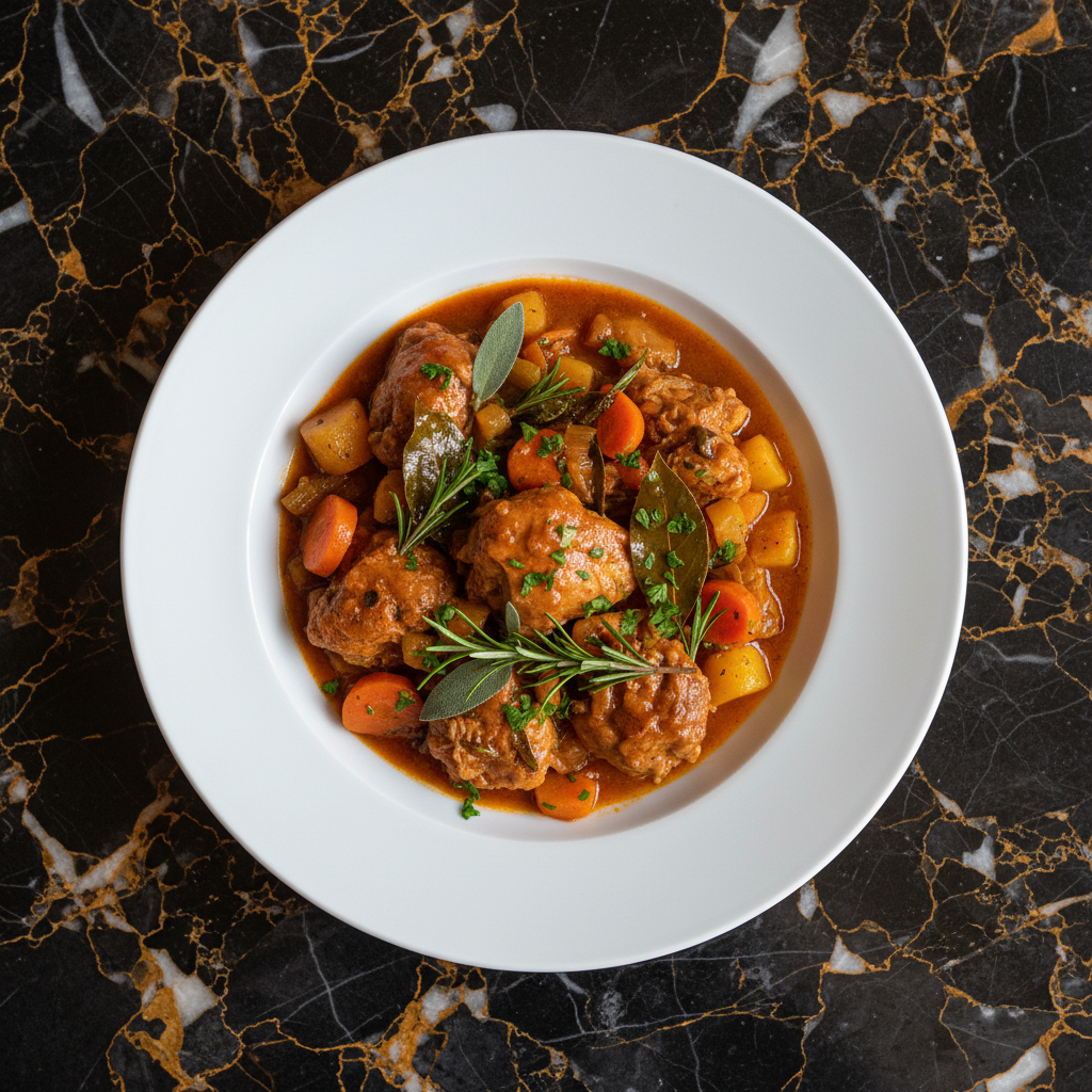 A flavorful rabbit stew slow-cooked with aromatic herbs, white wine, and vegetables, embodying the rustic heart of Sammarinese cuisine.