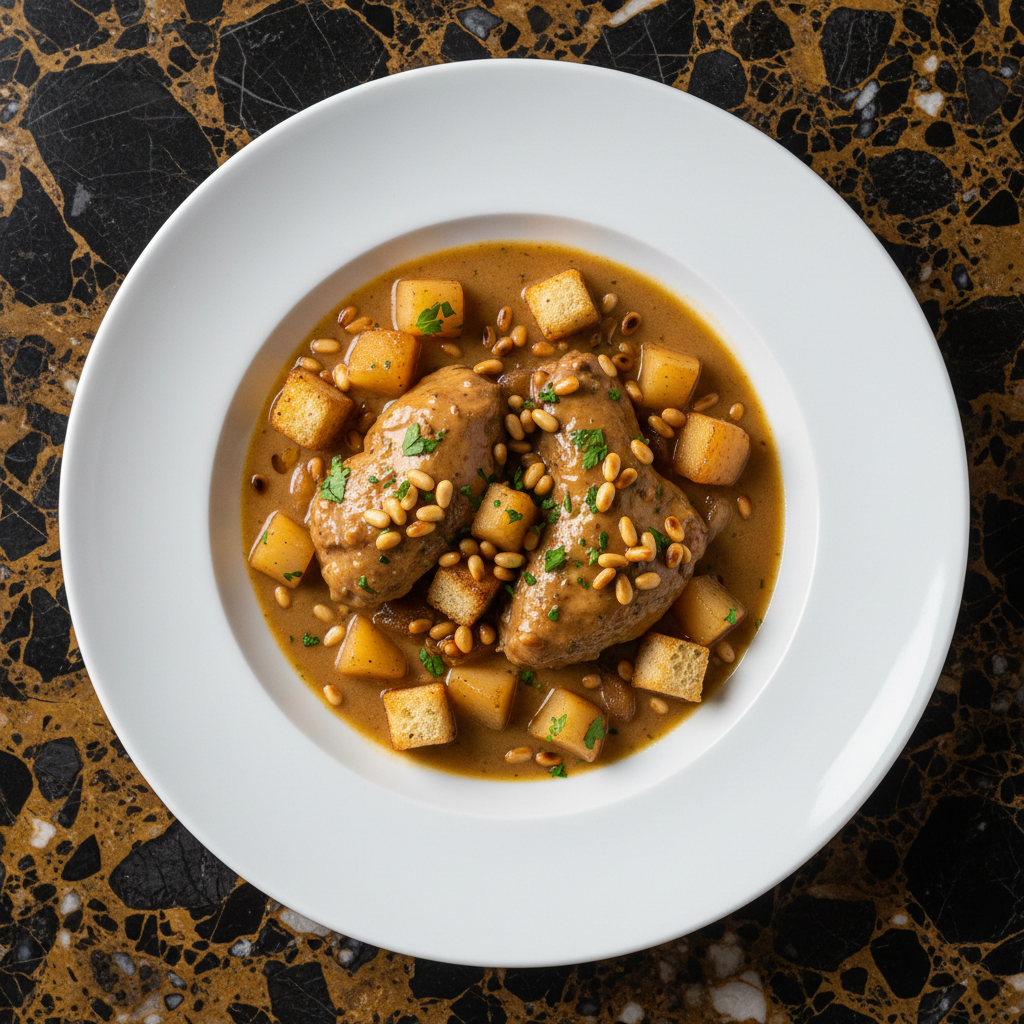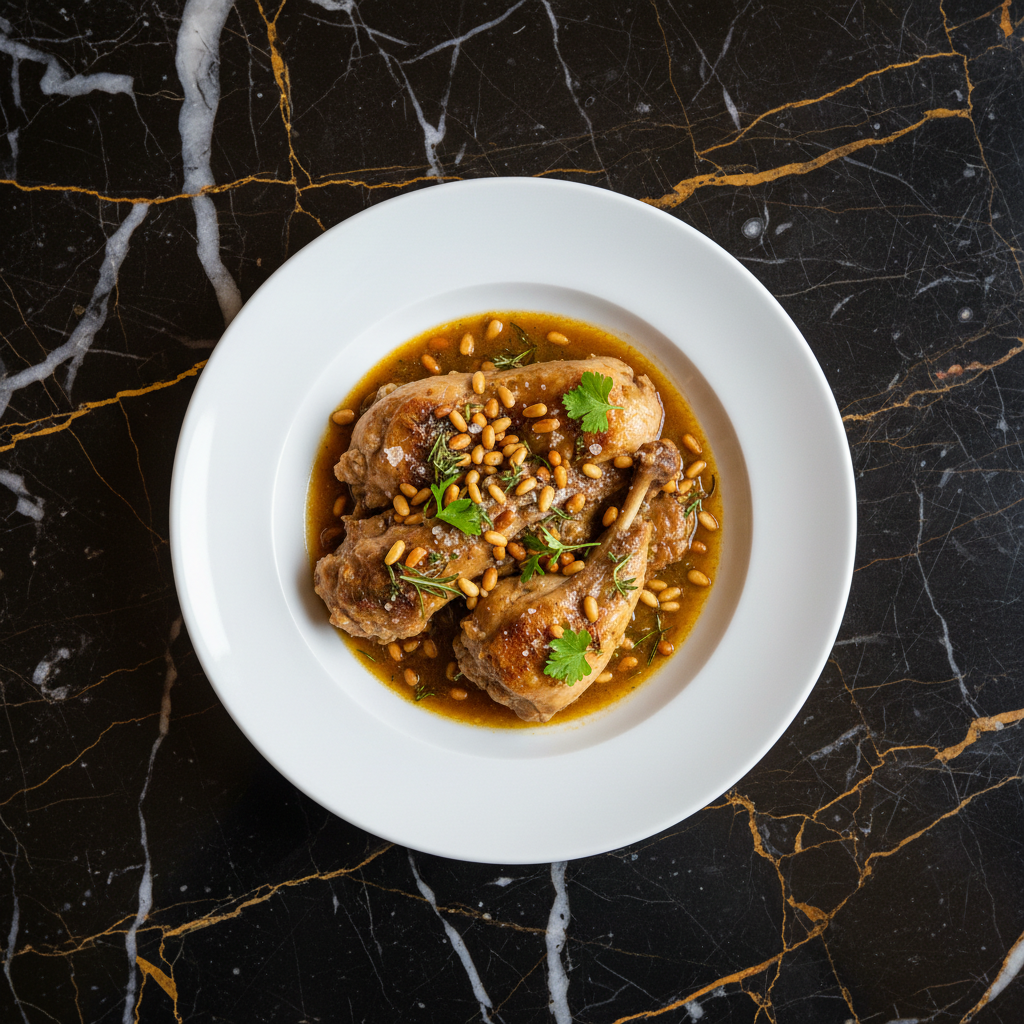 A rustic and flavorful Andorran dish featuring tender rabbit braised with aromatic herbs and the subtle sweetness of pine nuts.