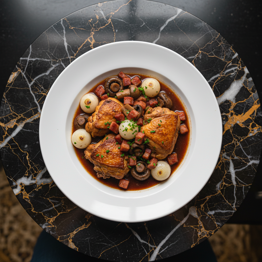 A quintessential French comfort dish, Coq au Vin features tender chicken braised in rich red wine with savory lardons, sweet pearl onions, and earthy mushrooms. This rustic Burgundian classic is perfect for a special occasion or a cozy evening.