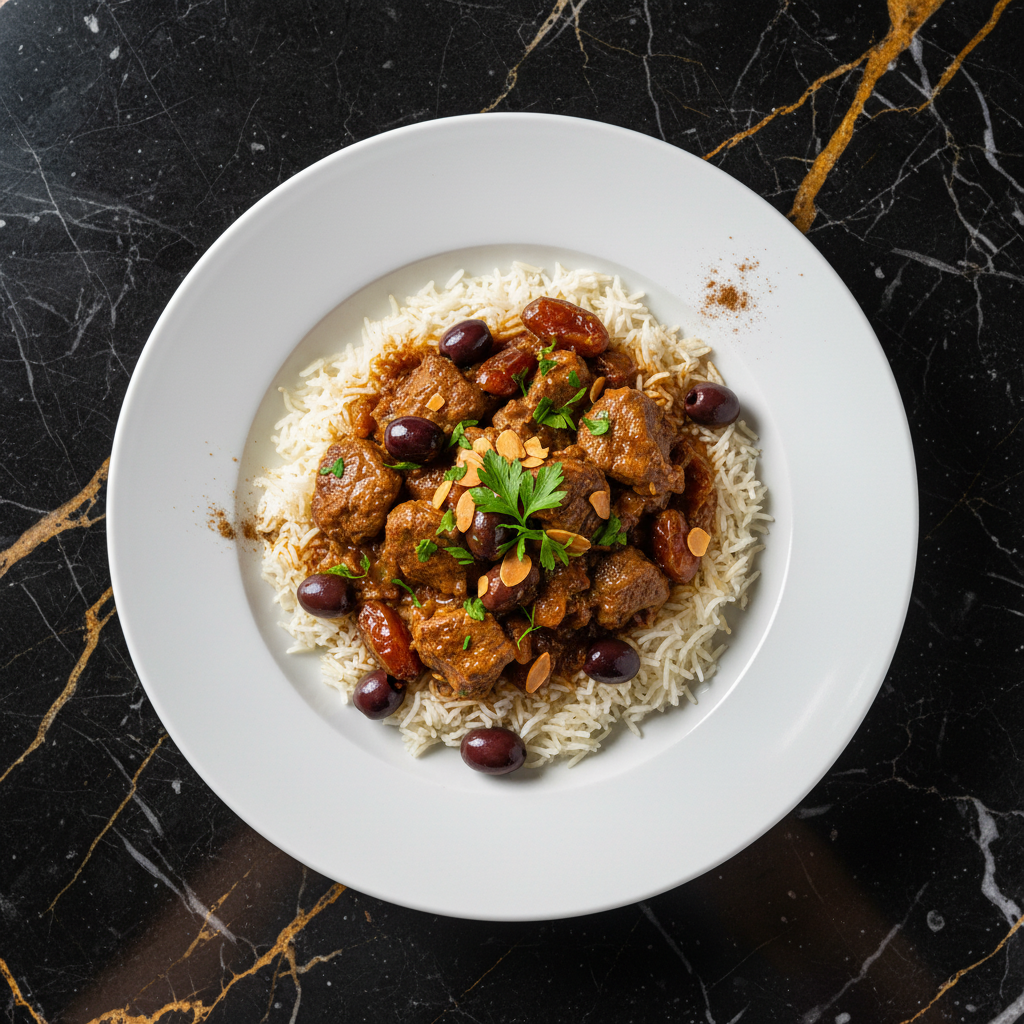 Un estofado de cordero reconfortante y aromรกtico, cocinado a fuego lento con aceitunas, dรกtiles, canela y miel, resultando en una carne tierna y una salsa rica y compleja. Se sirve tradicionalmente sobre arroz basmati.