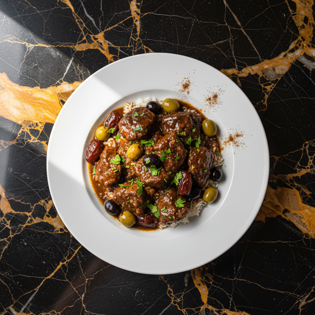 A rich and flavorful lamb stew slow-cooked with olives and dates, infused with warm spices like cinnamon, creating a dish that is both savory and subtly sweet. This hearty stew is perfect for a comforting meal, often served over rice.