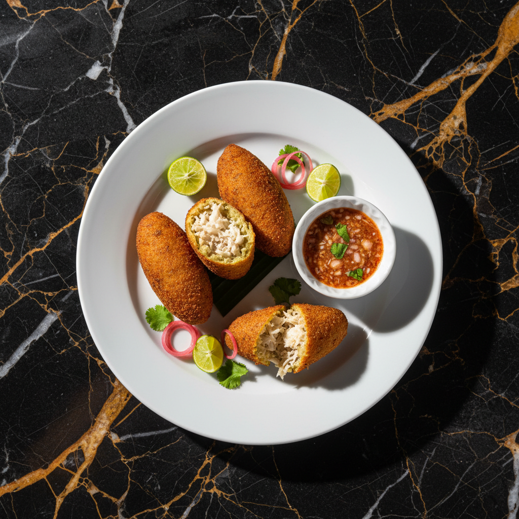 A savory fritter originating from the Azuero Peninsula, specifically Chitre, made with grated green plantains and filled with seasoned shredded fish, typically tuna or corvina. They are deep-fried to a golden crisp.