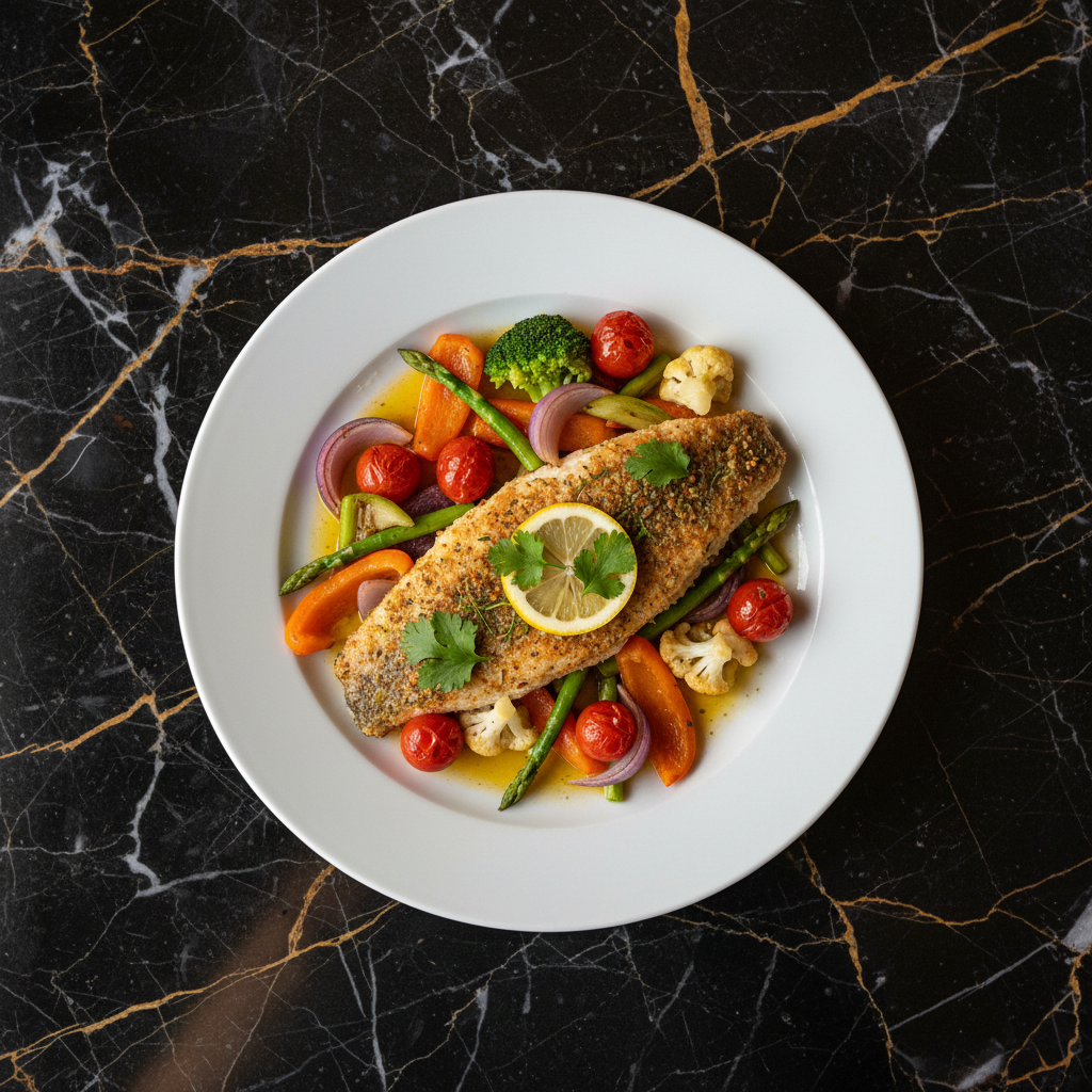 A simple yet elegant dish featuring fresh corvina (sea bass) baked with a medley of colorful vegetables, seasoned with herbs and a hint of citrus.