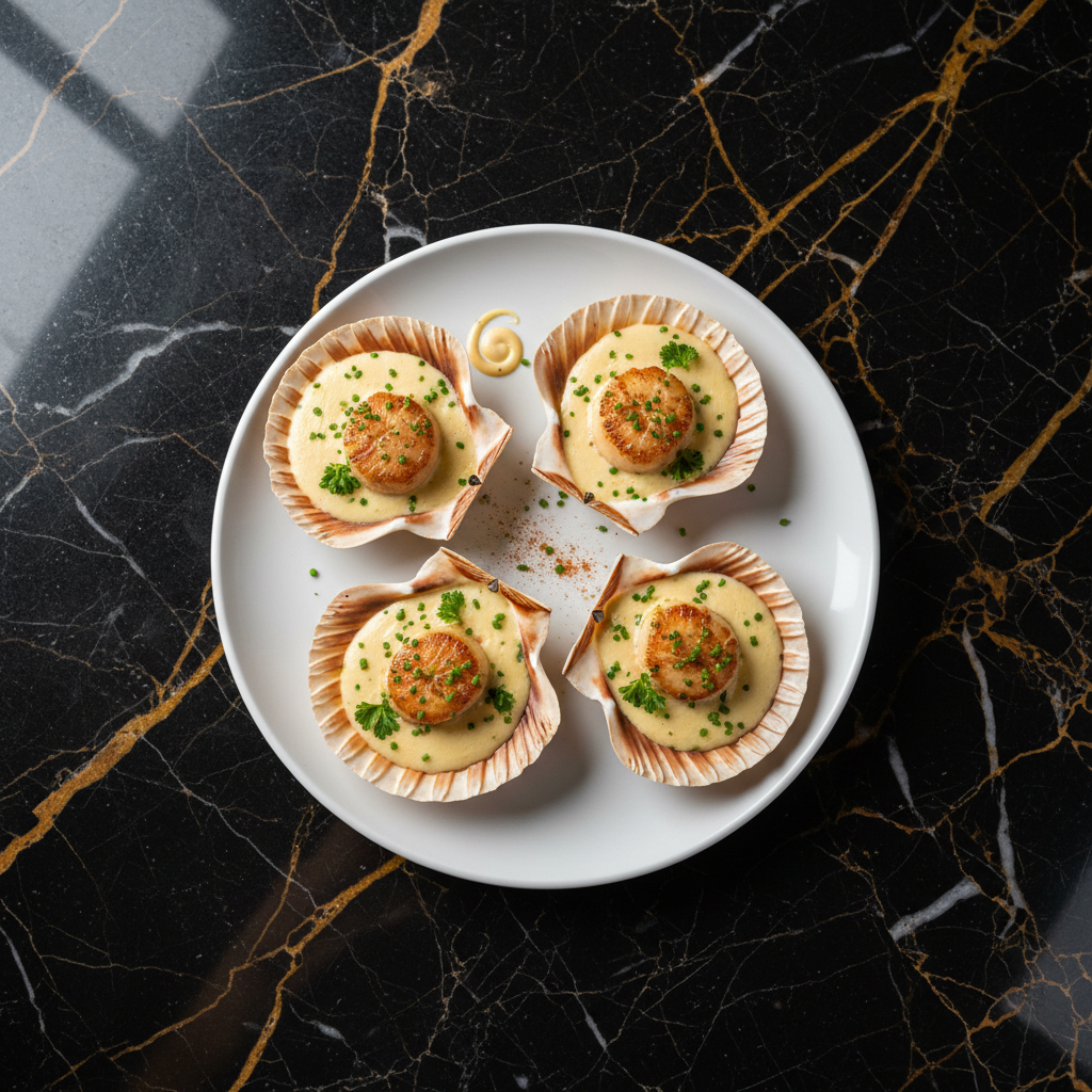 Elegant French scallops served in their shells with a rich, creamy mushroom and shallot sauce, topped with Gruyรจre cheese and breadcrumbs, then gratinated to golden perfection. A classic and impressive starter.