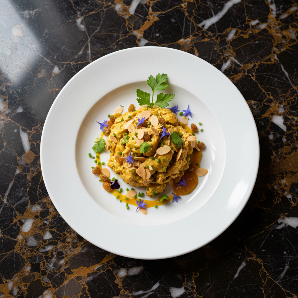 A classic British dish created to celebrate Queen Elizabeth II's coronation in 1953. This cold chicken salad features tender chicken coated in a creamy, curried mayonnaise with a hint of sweetness from mango chutney and a delightful chew from raisins. Perfect for sandwiches, jacket potatoes, or as part of a buffet.