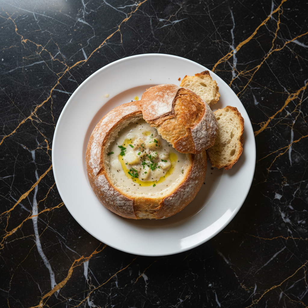 A classic San Francisco treat: rich and creamy New England clam chowder served piping hot inside hollowed-out, toasted sourdough bread bowls. The perfect comforting meal.