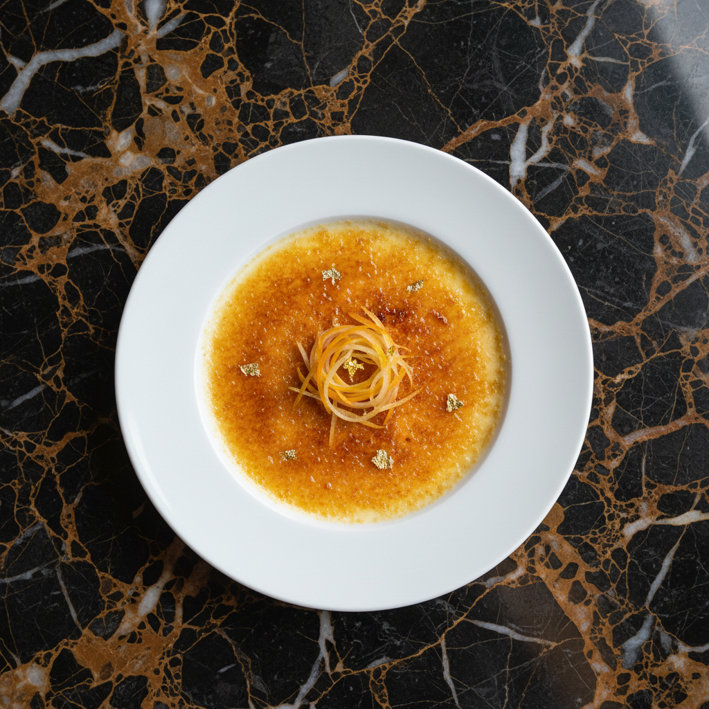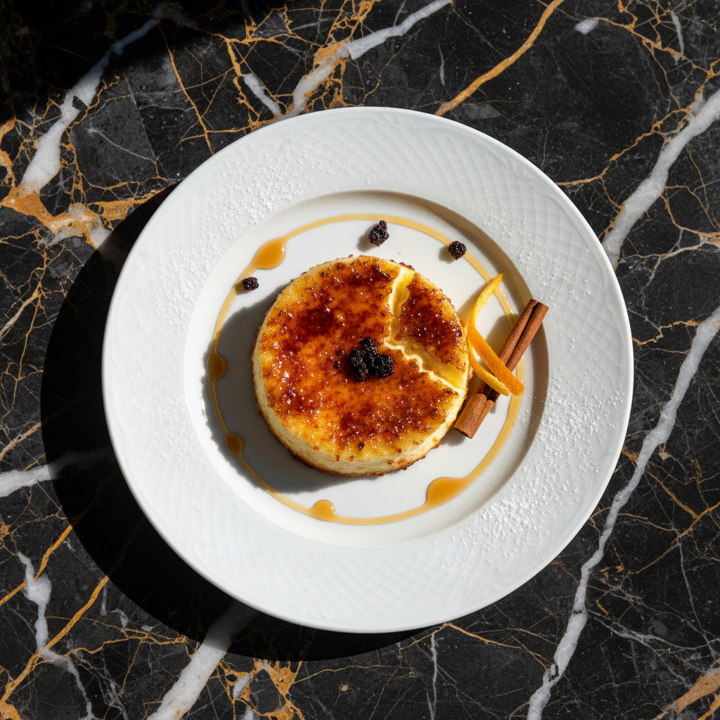 French burnt cream - a luxurious and silky vanilla custard base crowned with a shatteringly crisp, caramelized sugar crust. The satisfying crack of the spoon through the sugar is the signature joy of this classic dessert.