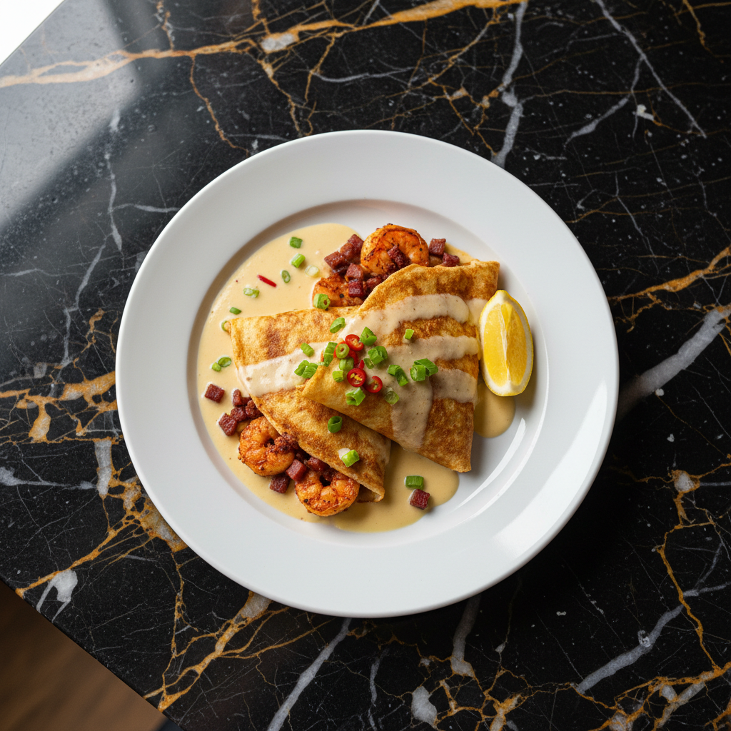 Delicate crรชpes filled with a rich and savory Creole-spiced shrimp and tasso ham mixture, often finished with a light bรฉchamel sauce.