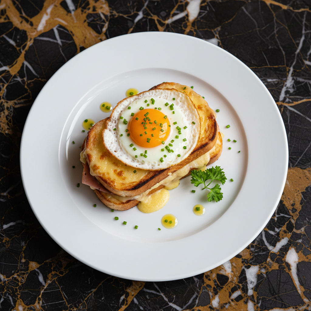 A classic French grilled ham and cheese sandwich, elevated with a rich bรฉchamel sauce and topped with melted Gruyรจre. For a Croque Madame, simply add a fried egg on top.