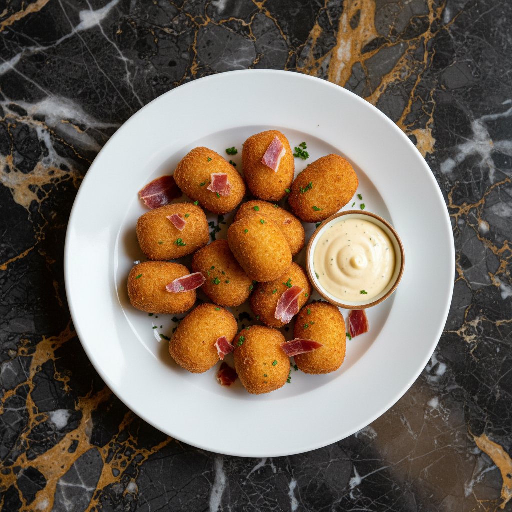 Authentic Spanish ham croquettes featuring a rich, creamy bรฉchamel sauce infused with finely diced Jamรณn Serrano, coated in crispy breadcrumbs, and fried to a perfect golden brown. A quintessential Spanish tapa.