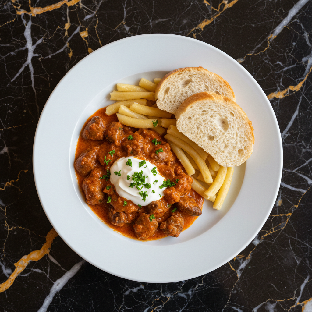 A rich and creamy Hungarian dish featuring tender chicken livers simmered in a flavorful paprika-infused sauce, finished with a dollop of sour cream. It's a quick and comforting meal often served with bread or noodles.