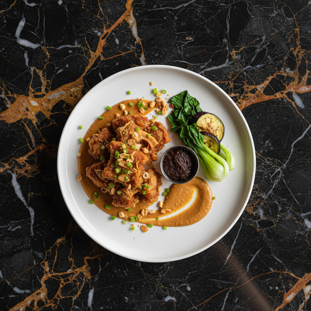 A modern Filipino twist on Kare-Kare, featuring exceptionally tender, slow-braised oxtail that is then crisped to perfection and served with a rich peanut sauce. This dish offers a delightful contrast of textures and a complex, savory flavor profile.
