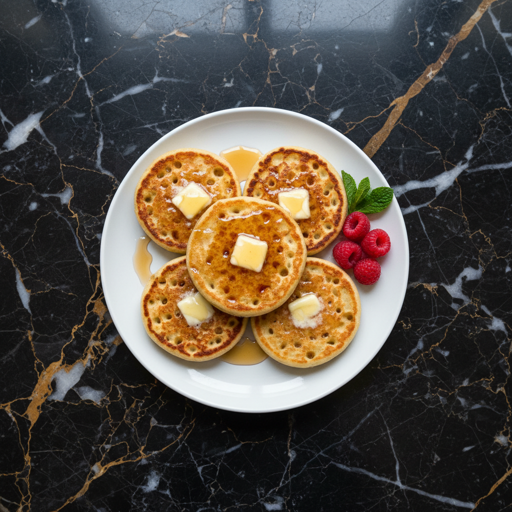 Classic British griddle cakes, known for their wonderfully spongy texture and signature honeycomb of holes. Perfect for a comforting tea time treat.