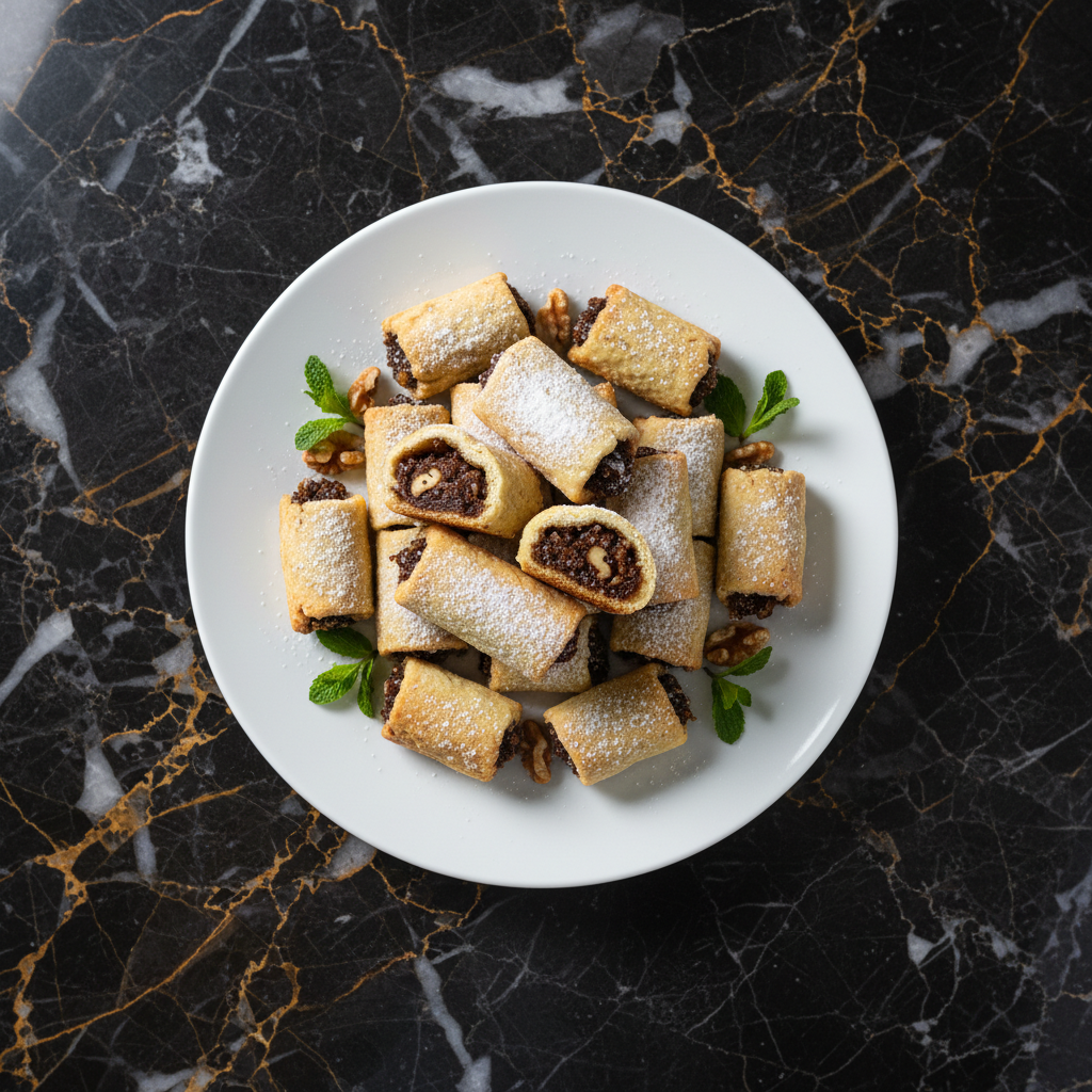 Nostalgic, melt-in-your-mouth cookies with a sweet date and walnut filling, encased in a tender, buttery dough. These cookies are a beloved treat, often enjoyed during holidays like Purim and Tu B'Shevat.