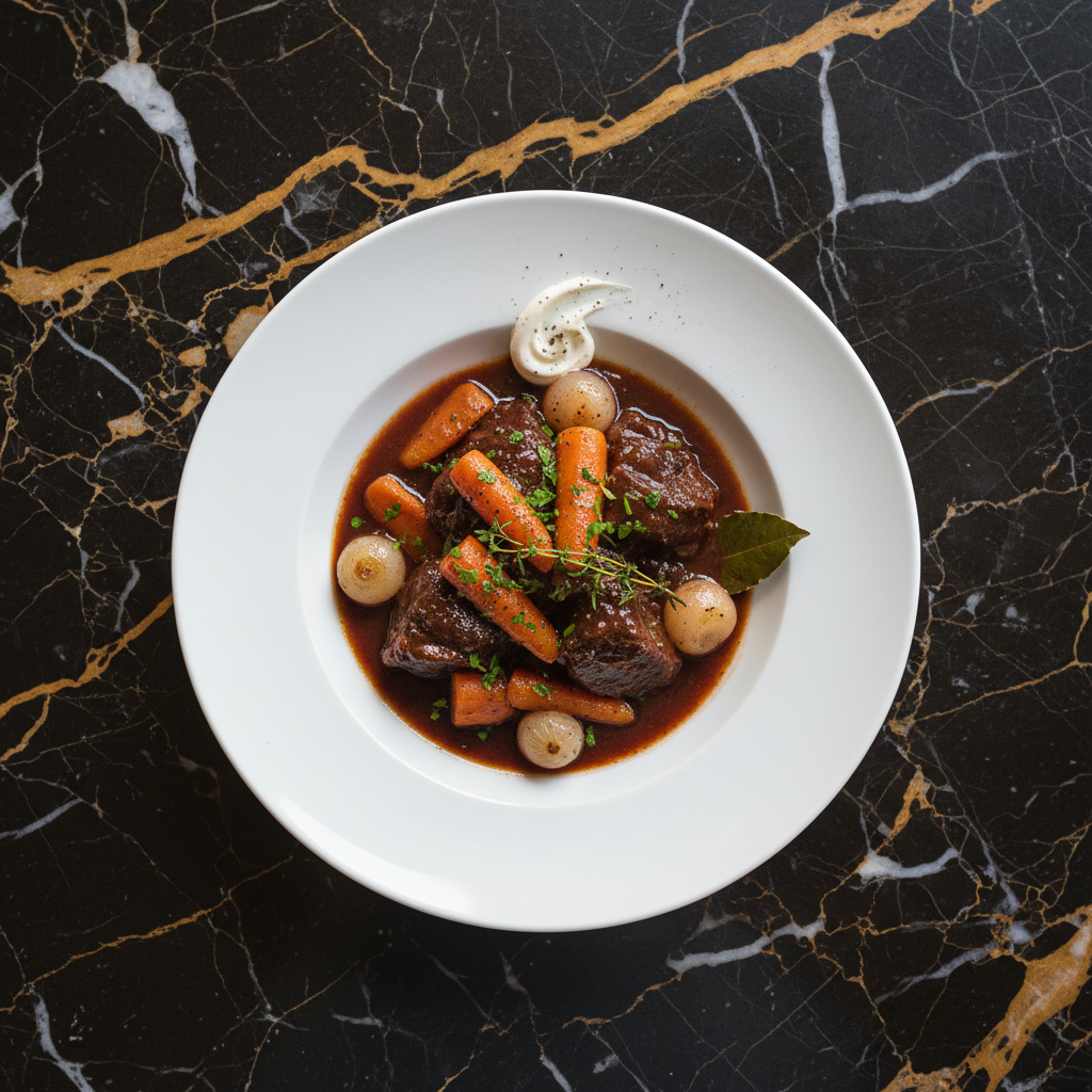 A rich and savory beef stew, slow-cooked in red wine with aromatic vegetables and herbs, reflecting the Provenรงal influences on Monegasque cuisine. This hearty dish is perfect for a comforting meal.