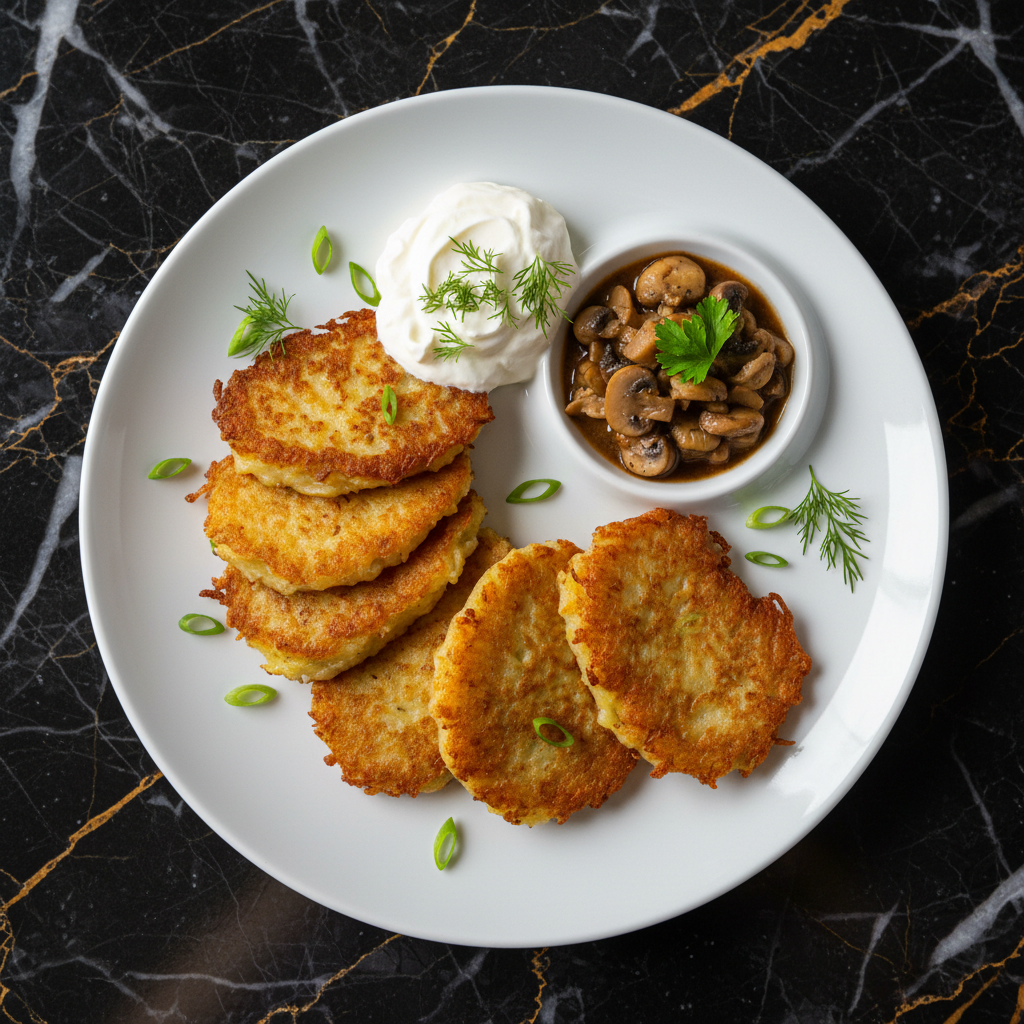 Crispy on the outside, tender on the inside, these classic Ukrainian potato pancakes are made from grated potatoes and onions, fried until golden brown. Typically served with sour cream or mushroom sauce.