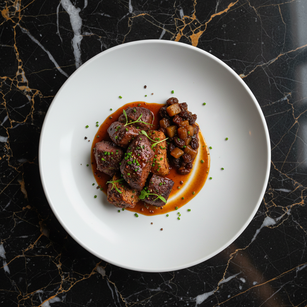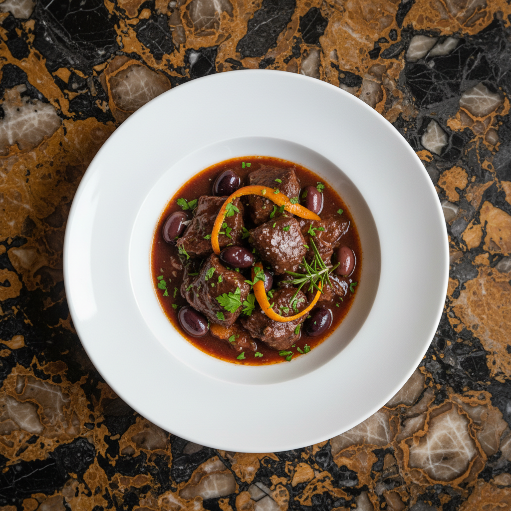 A classic Provenรงal beef stew, slow-braised in red wine with aromatic vegetables, olives, and a hint of orange peel. This rich and deeply flavorful dish is the epitome of Mediterranean comfort food, best enjoyed after a day or two of resting to allow the flavors to meld.