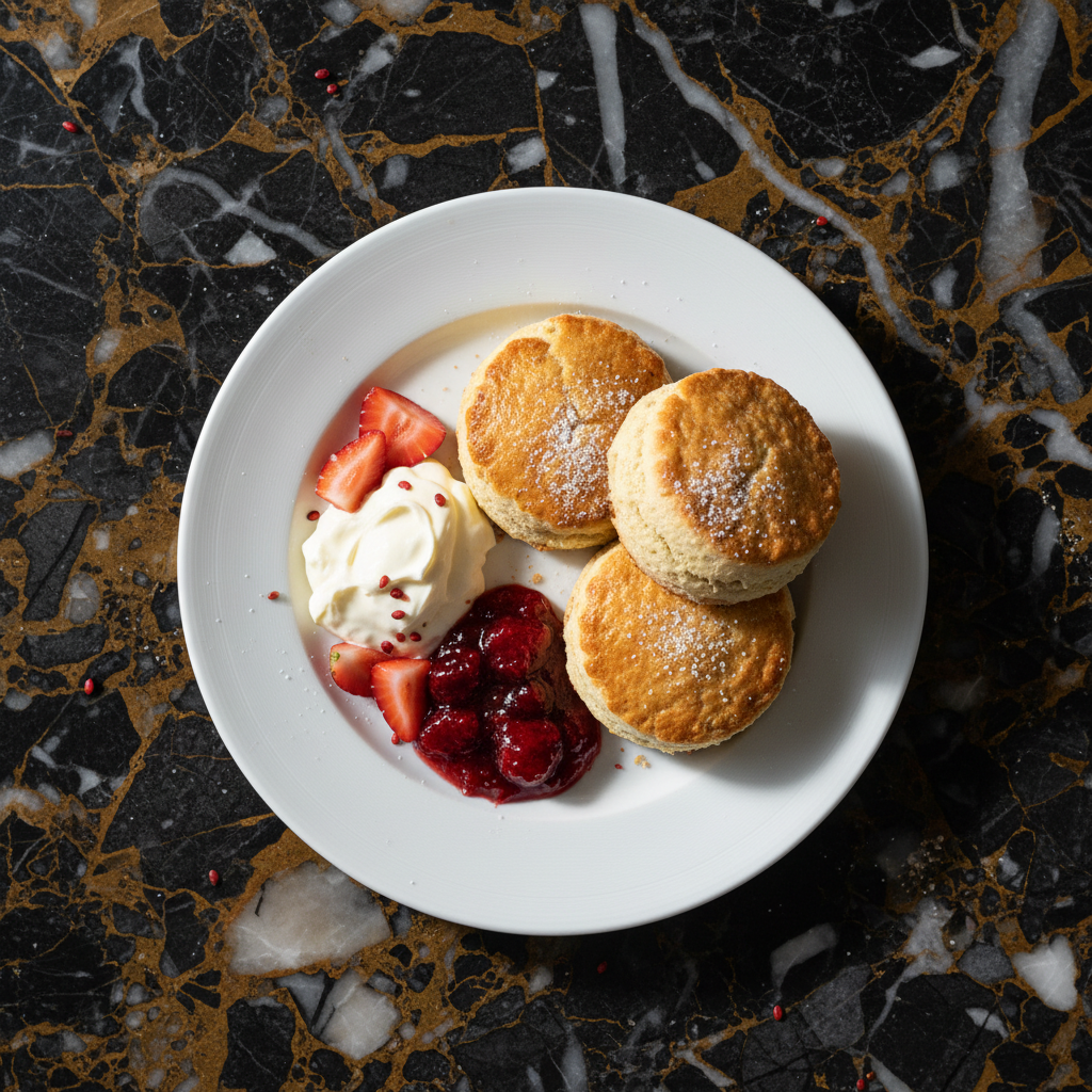 Light and fluffy scones, traditionally served with clotted cream and strawberry jam, embodying the classic Devonshire cream tea experience.