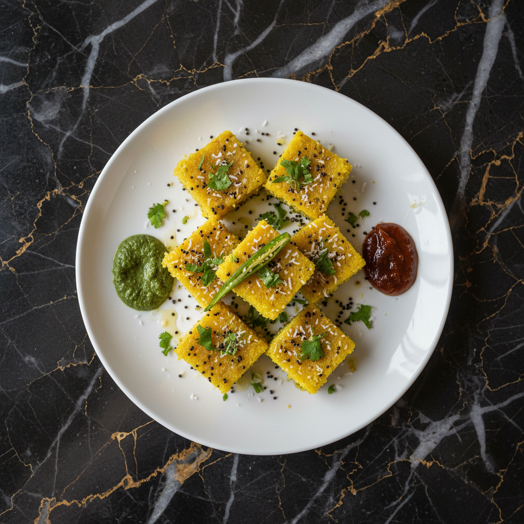 Fluffy, steamed savory cakes made from fermented gram flour (besan), a popular and healthy snack from Gujarat, India. They are characterized by their light, spongy texture and are often tempered with a sweet and spicy mixture.