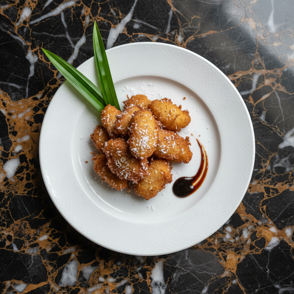 Dhonkeyo Kajuru are sweet, deep-fried fritters made from mashed ripe bananas, coconut, and flour, offering a delightful crispy exterior and soft, sweet interior.