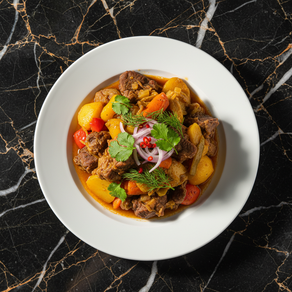 A rich and flavorful beef stew, slow-cooked with aromatic spices, vegetables, and a hint of rum, showcasing the Creole influence on Seychellois cuisine.