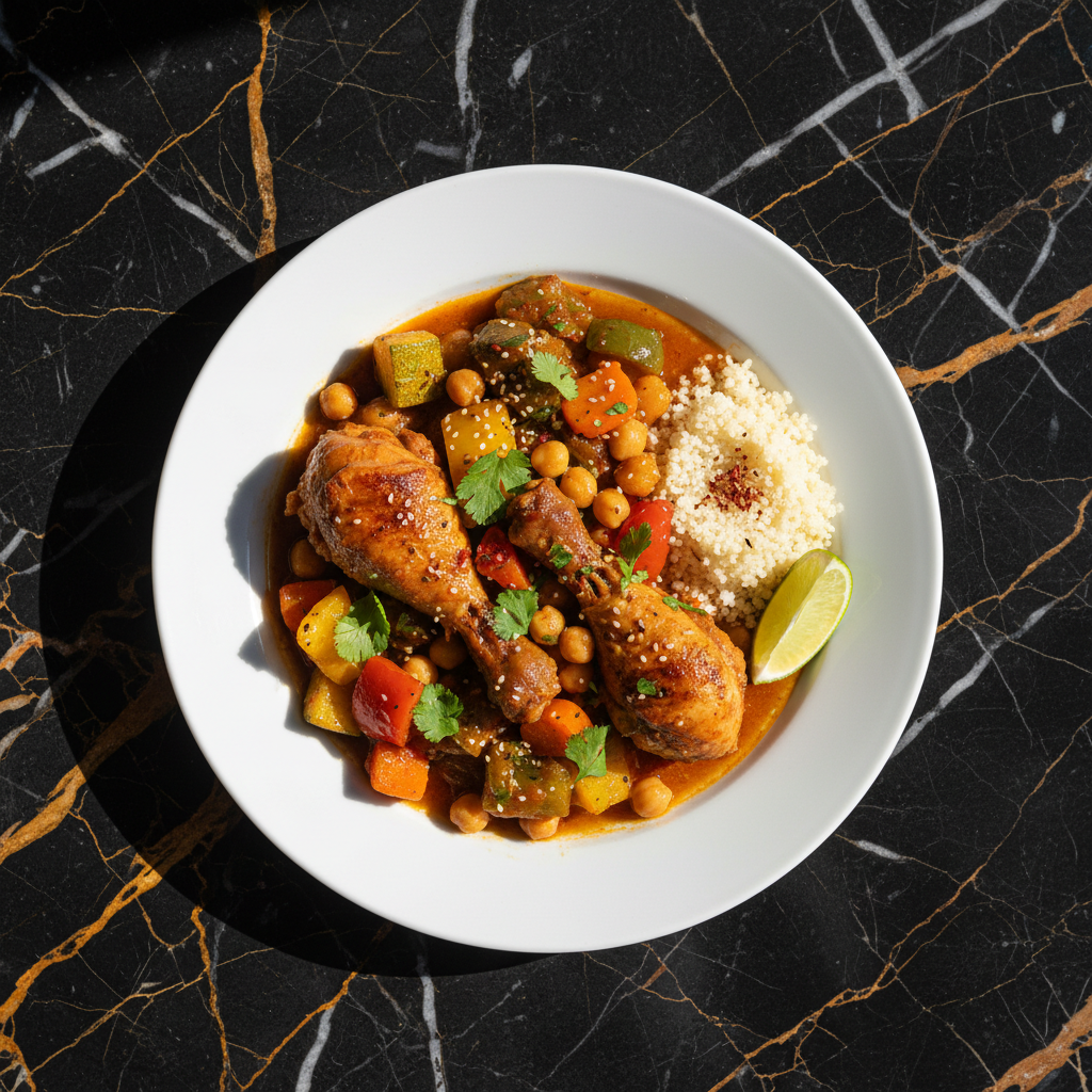 A flavorful and aromatic tagine featuring tender chicken pieces simmered with a medley of vegetables and fragrant spices, reflecting the diverse culinary influences in Djibouti.