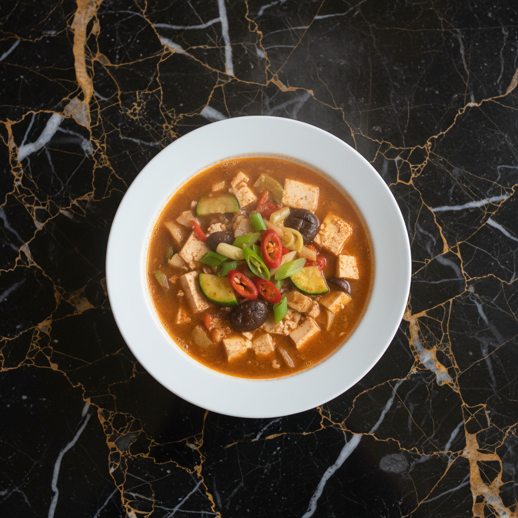 A hearty and deeply flavorful Korean stew made with fermented soybean paste (doenjang), tender vegetables, and soft tofu. This earthy and savory dish is a staple in Korean home cooking, perfect for a comforting meal.