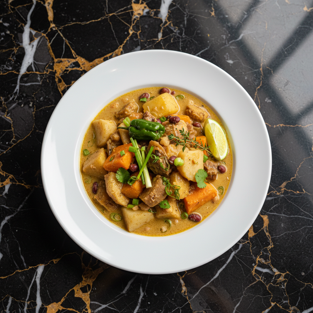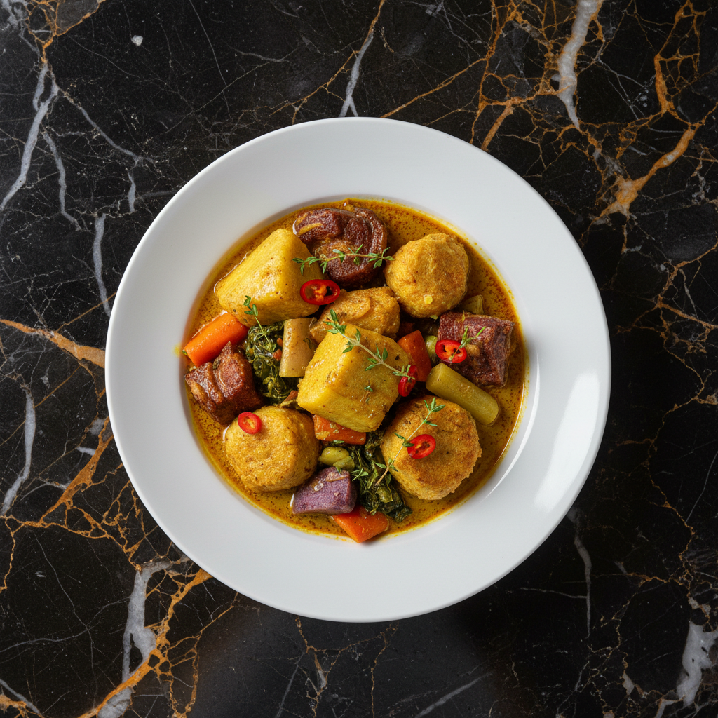 A hearty and nourishing stew featuring a variety of starchy ground provisions, simmered in a flavorful coconut milk broth with aromatic herbs and spices. This dish is a staple, showcasing the island's agricultural bounty.