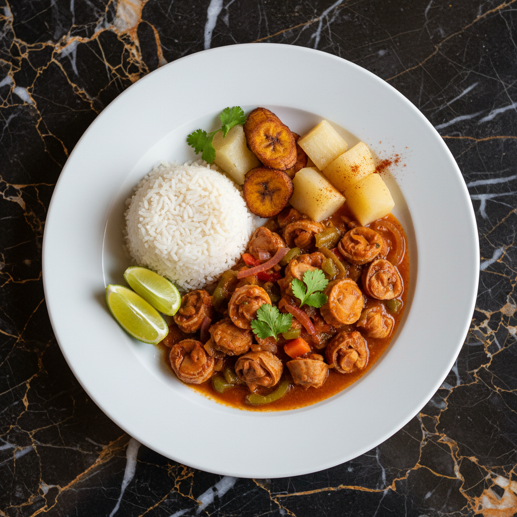 Lambi Guisado is a flavorful and tender stewed conch dish, a staple in Dominican cuisine. The conch is slow-cooked in a rich tomato-based sauce with aromatic vegetables and spices, resulting in a tender texture and deep flavor. It's often served with rice and local vegetables.