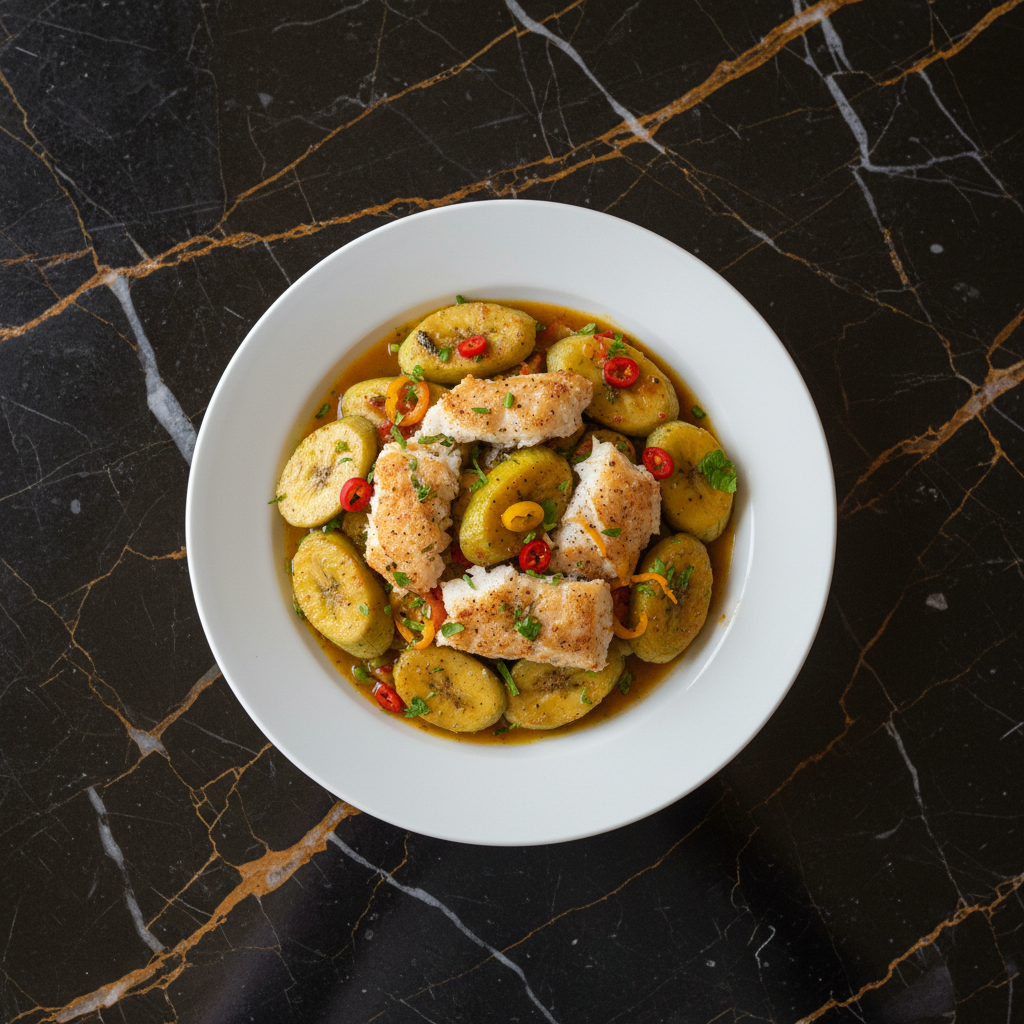 A quintessential Dominican dish, this recipe features rehydrated salt cod (saltfish) cooked with tender green bananas (green figs) in a savory, herb-infused sauce.