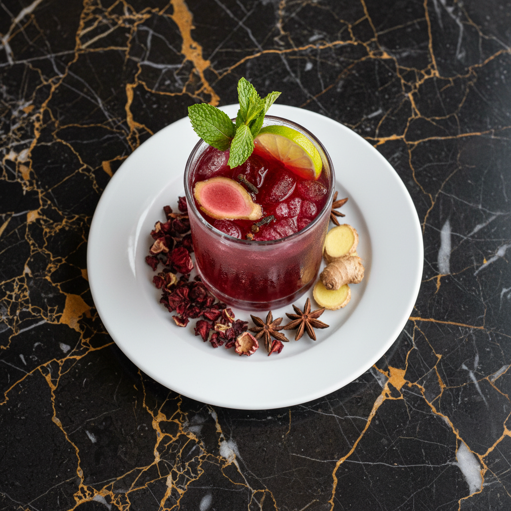 A vibrant and refreshing ruby-red beverage made from dried sorrel (hibiscus sabdariffa) calyces, infused with spices like ginger and cloves, and sweetened to taste. It's a popular drink, especially during the holiday season, offering a delightful tart and sweet flavor.