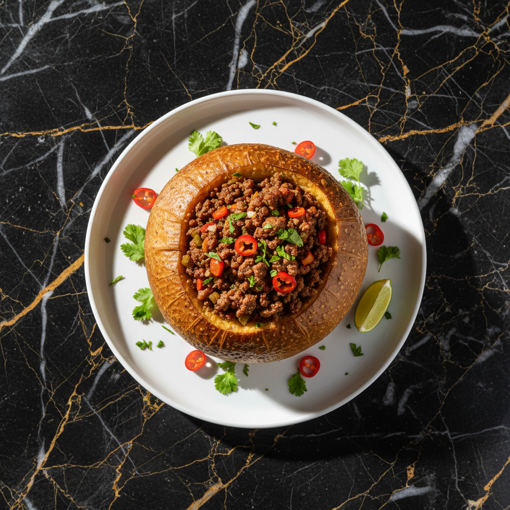 A hearty and flavorful dish where a whole breadfruit is hollowed out and filled with a savory mixture, typically of seasoned ground meat, and then baked until tender. It's a versatile dish that can be served as a main course or a substantial side.