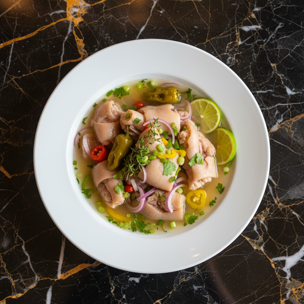 Dominican Souse is a flavorful and tangy dish, typically made with boiled pig's feet or cow's heel, marinated in a zesty broth of lime juice, onions, peppers, and herbs. It's often served cold and is a popular appetizer or snack, especially during festive occasions.