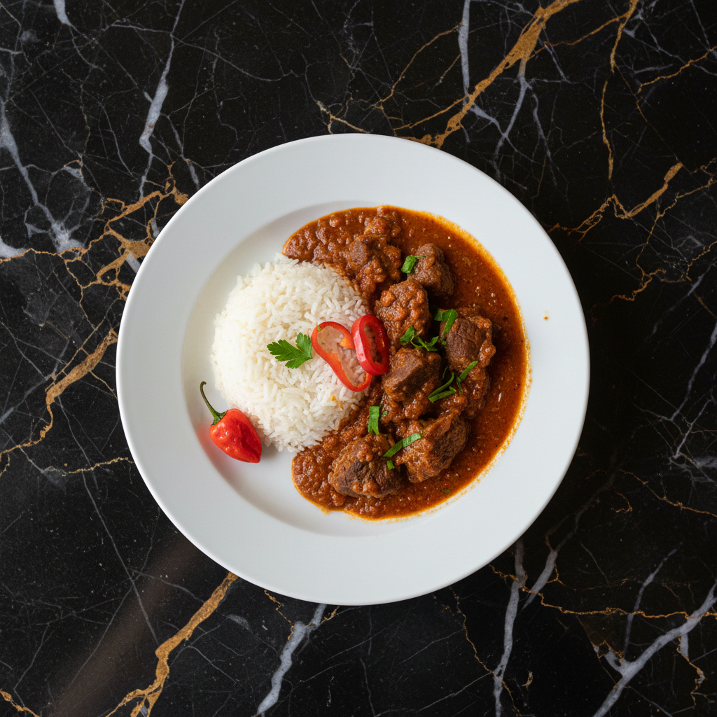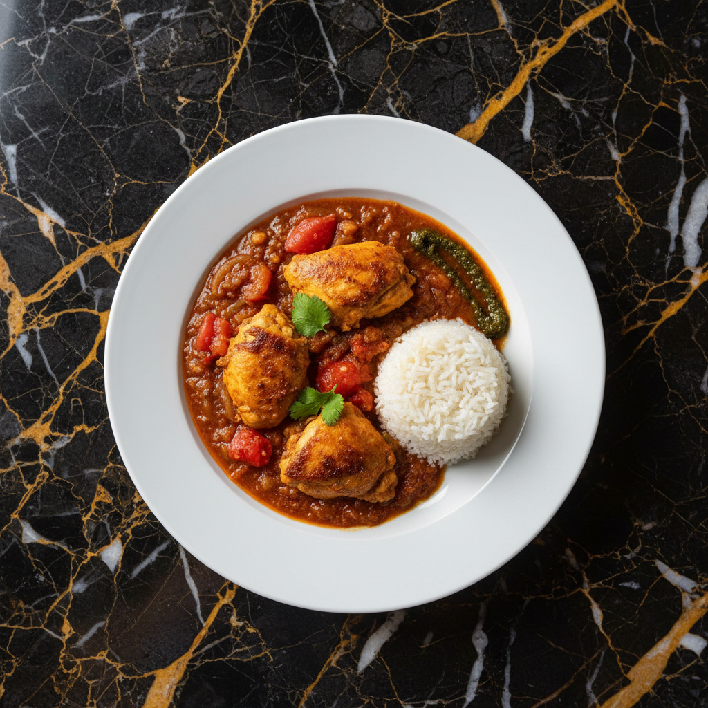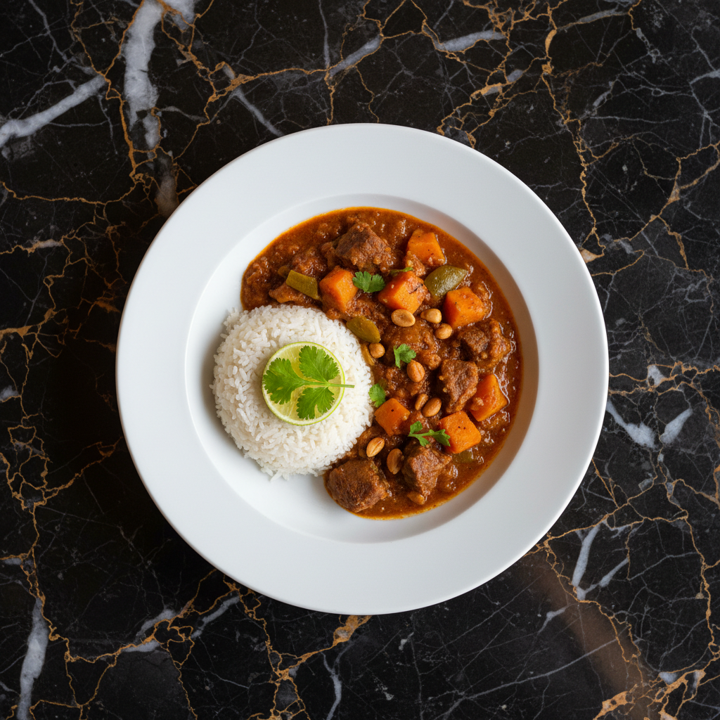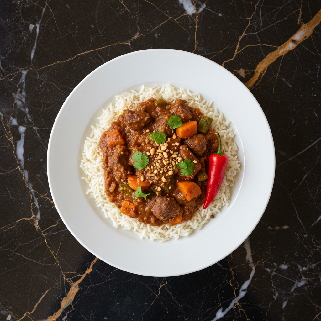 A rich and comforting West African peanut stew, often made with meat (beef or chicken) and vegetables, served over rice.