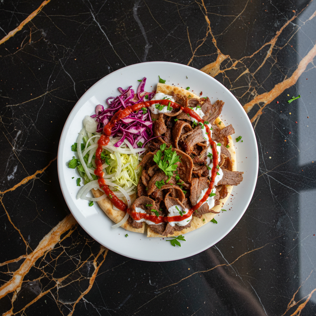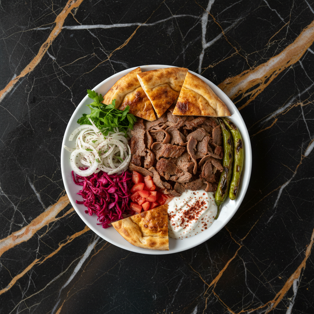 Turkey's iconic rotating meat cone - seasoned lamb and beef shaved thin, served in bread with vegetables and sauces. This recipe simulates the flavor and texture without a vertical rotisserie.