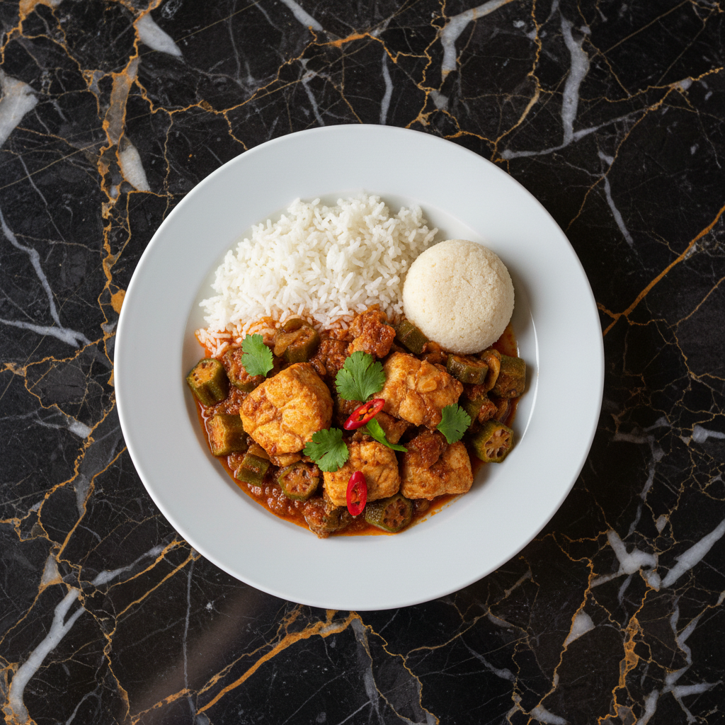 A flavorful and hearty stew made with okra, fish, and aromatic seasonings, often served with starchy accompaniments like fufu or rice.