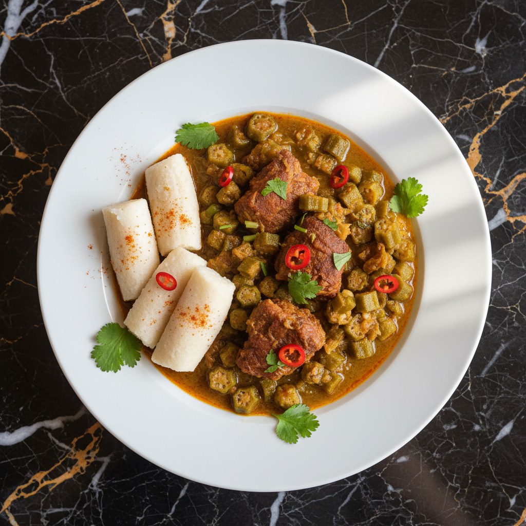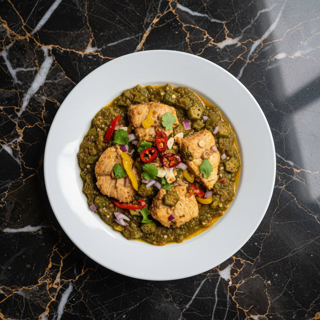 A flavorful and hearty okra-based stew featuring fish, often made with dried, salted, or smoked fish, and seasoned with onions, garlic, peppers, and Maggi cubes. It's a staple that showcases the importance of fish and okra in Central African cuisine.