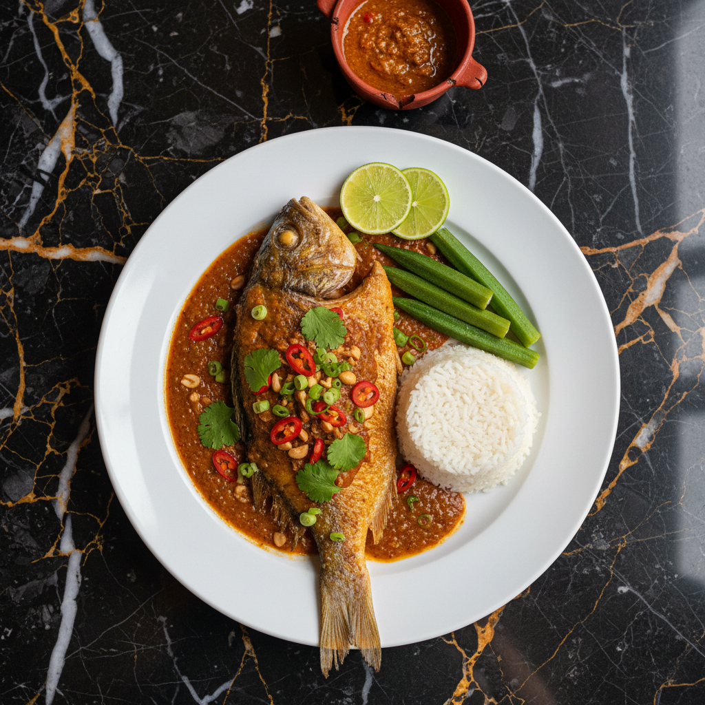 A flavorful whole fish (Dorรฉe, often Tilapia or similar white fish) prepared with a spicy peanut sauce, showcasing a common yet adaptable preparation method in Burkinabรฉ cuisine.