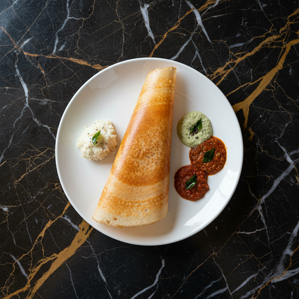 A crispy, fermented crepe made from rice and lentils, a quintessential South Indian breakfast dish. It's characterized by its delicate crispness on the outside and a soft, slightly chewy interior.