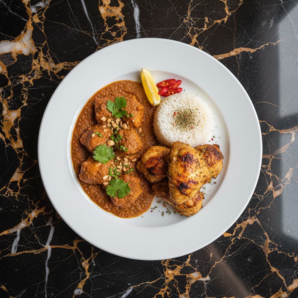 Tender, slow-cooked chicken in a rich and savory peanut butter sauce (Dovi), served alongside grilled chicken pieces marinated in traditional Zimbabwean spices.