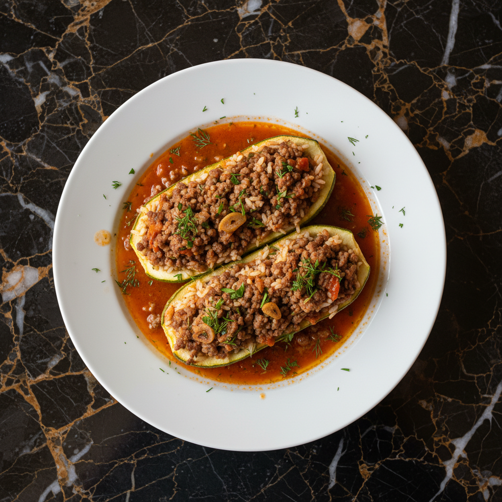 Dovlecei Umpluศi cu Carne (Stuffed Zucchini with Meat) is a classic Romanian dish where hollowed-out zucchini are filled with a savory mixture of ground meat, rice, and herbs, then baked in a tomato-based sauce.
