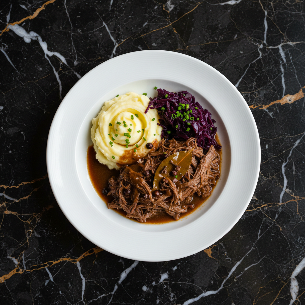 Draadjesvlees, meaning 'thready meat,' is a quintessential Dutch comfort food. This dish features a cut of beef, typically brisket or chuck, slow-braised for hours in a rich, aromatic gravy until it becomes incredibly tender and easily shreds into succulent strands. It's often seasoned with classic spices like cloves, bay leaf, cinnamon, and juniper berries, with a touch of vinegar or wine for tanginess. Traditionally served with mashed potatoes and red cabbage, it's a hearty and warming meal perfect for colder days.