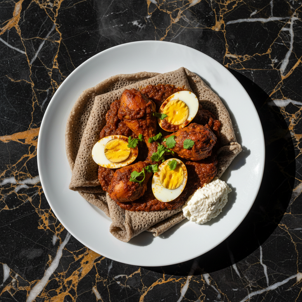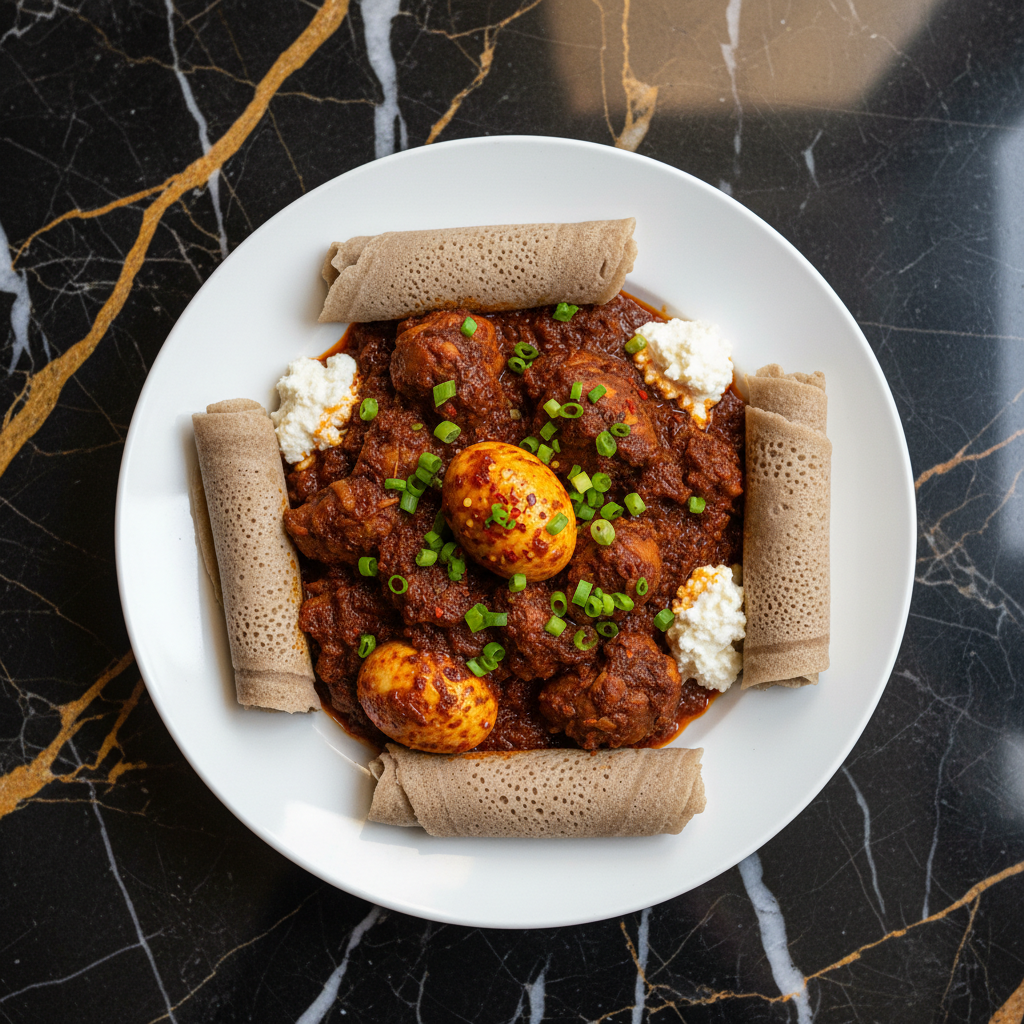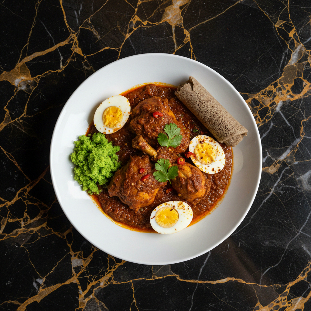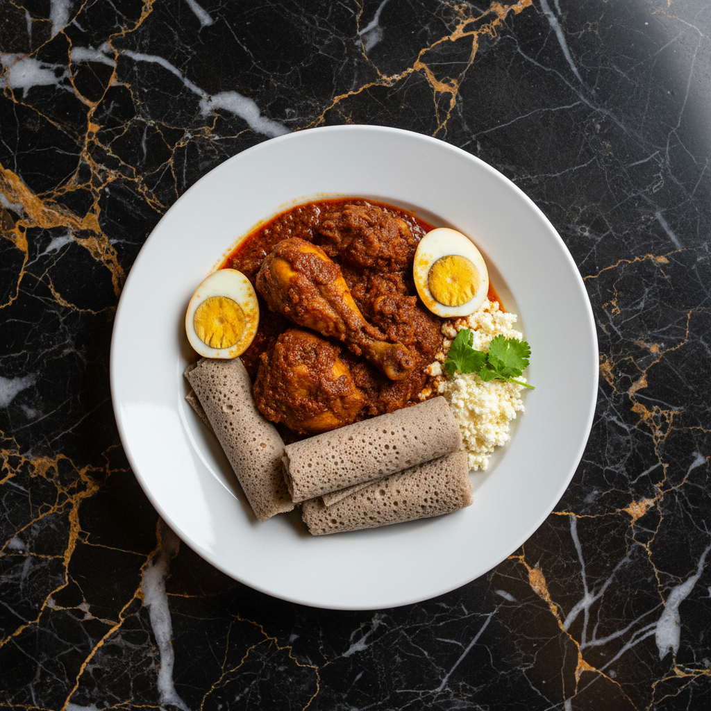 A deeply flavorful and celebratory Ethiopian chicken stew, rich with the complex spice blend of berbere and slow-cooked onions. Traditionally served with injera, a sour flatbread.