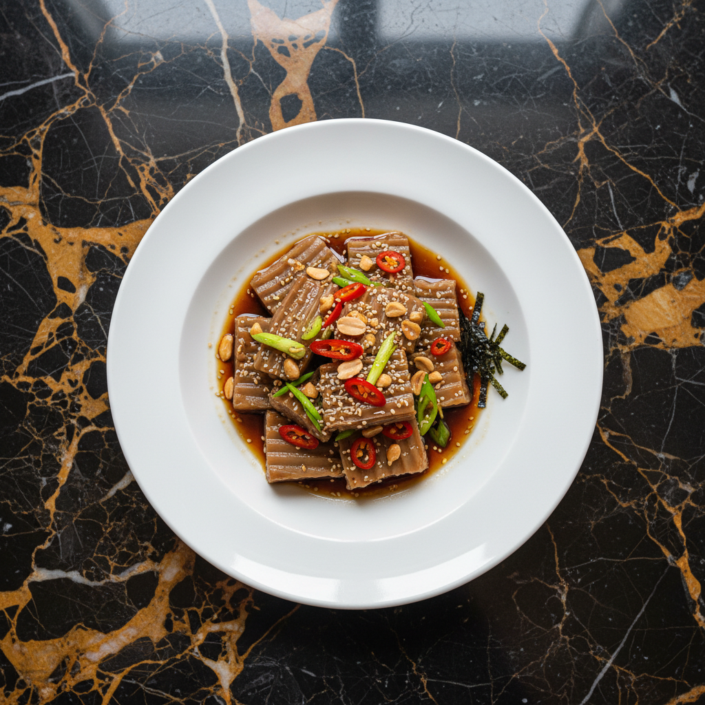 A unique and refreshing Korean banchan (side dish) made from nutty acorn starch, this Dotorimuk is a jiggly, translucent jelly that's typically served chilled and dressed with a savory soy-sesame sauce. It's a healthy and satisfying appetizer or side.